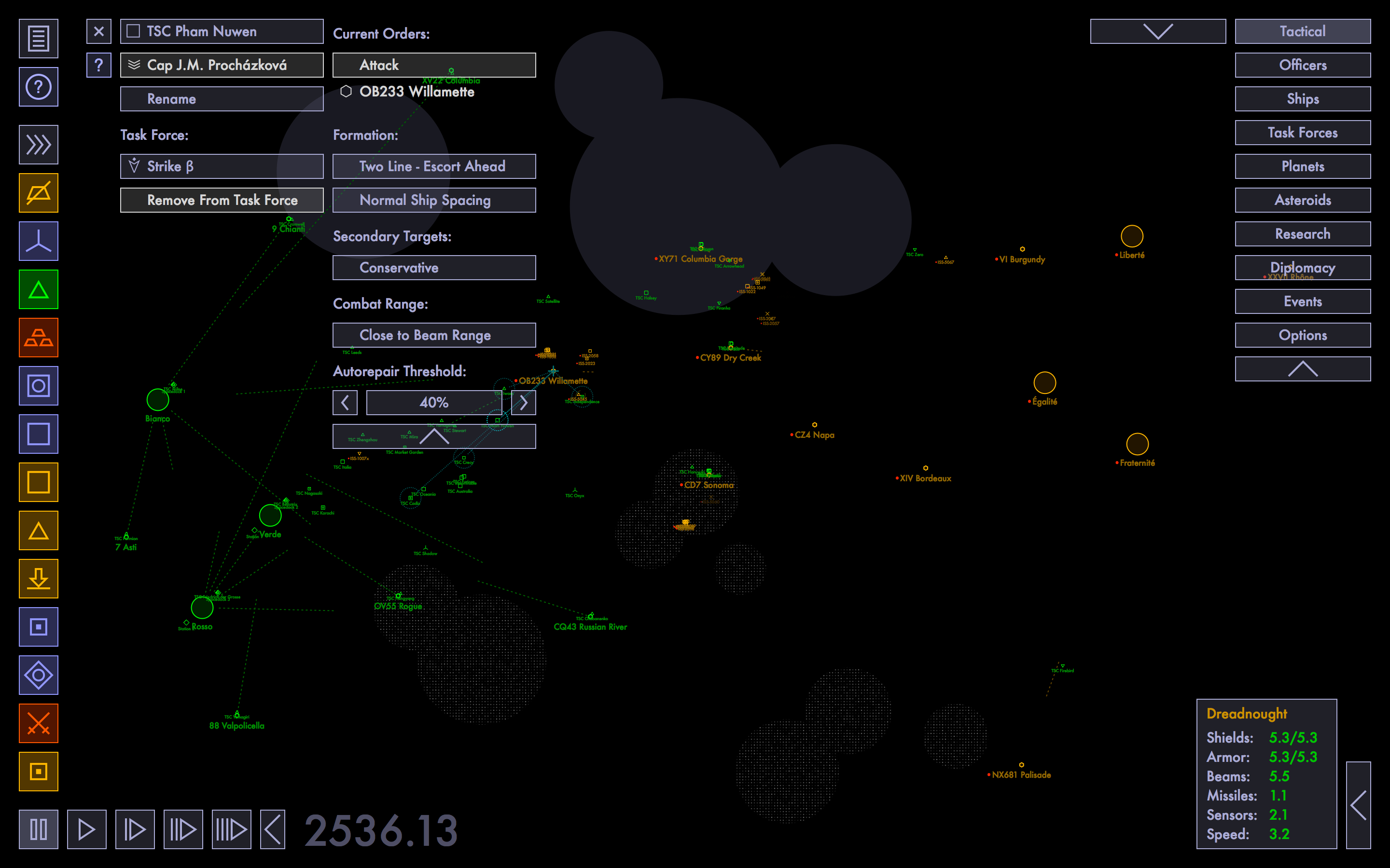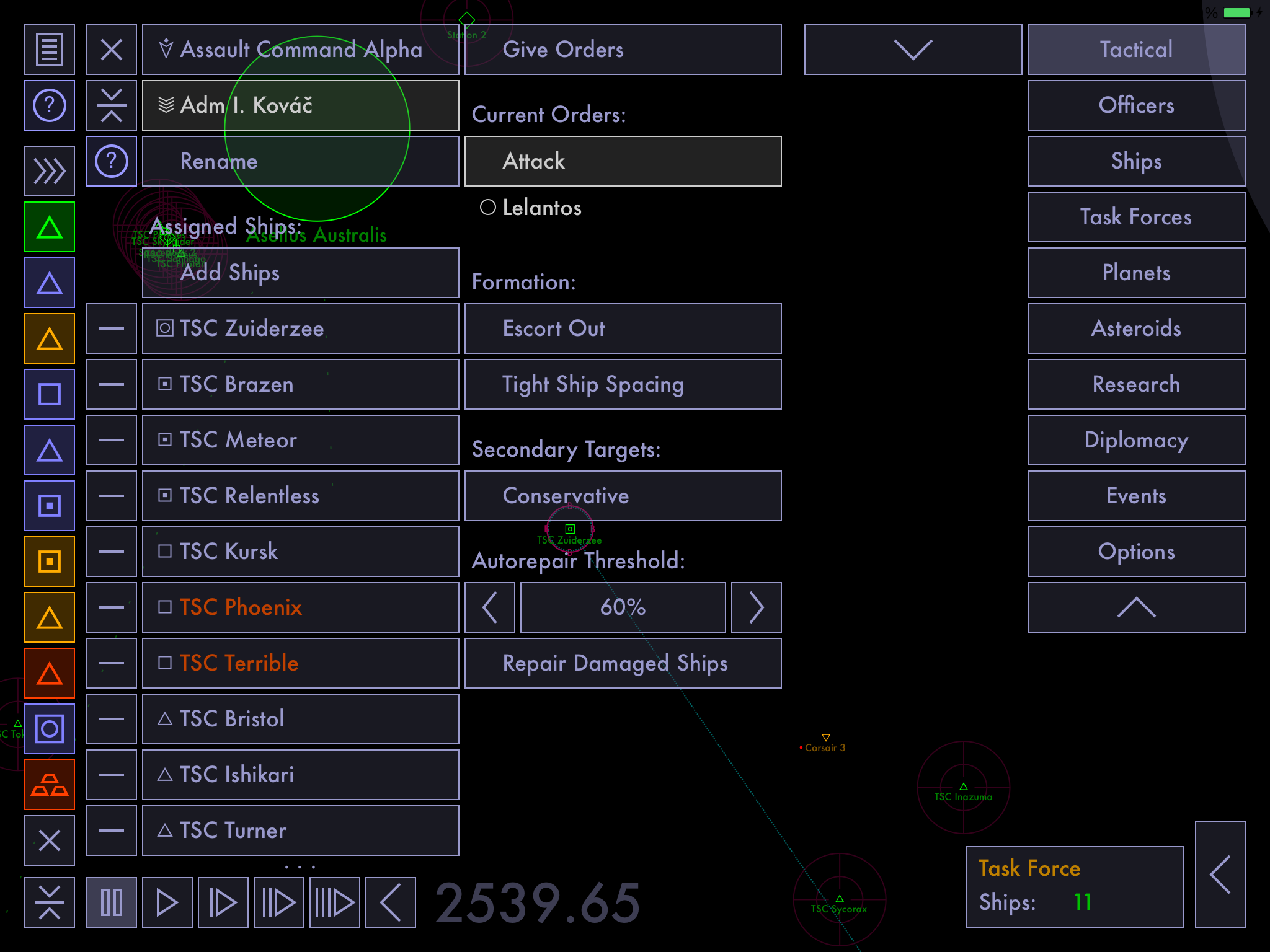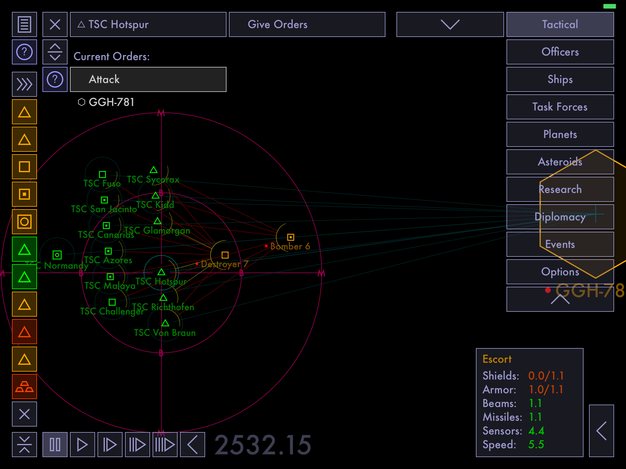 Tactical Space CommandOrganize ships into task forces. Give your ships and task forces orders. Promote and assign officers to command your ships, stations and task forces. Allocate production. Customize your research focus. Take that rock or die trying. Smash any planetary defenses that get in your way. Bring death and bitter defeat to all that oppose you. (Tactical Space Command is only an abstract tactical space combat simulation. No lifeforms were harmed in the making of this game; all civilian and military casualties are merely simulated. Past performance does not guarantee total victory, offer void in partial vacuum. Do not break glass, there is no emergency.) For Mac and iPad: